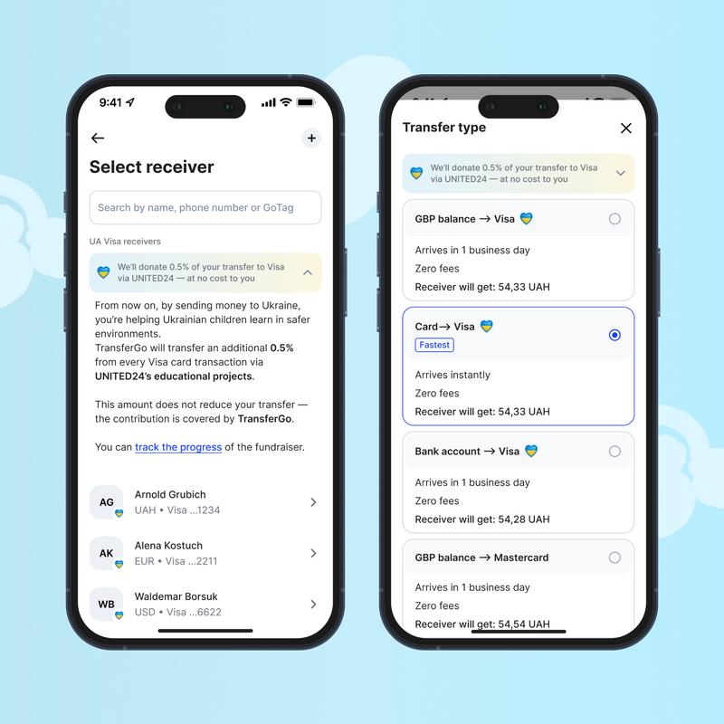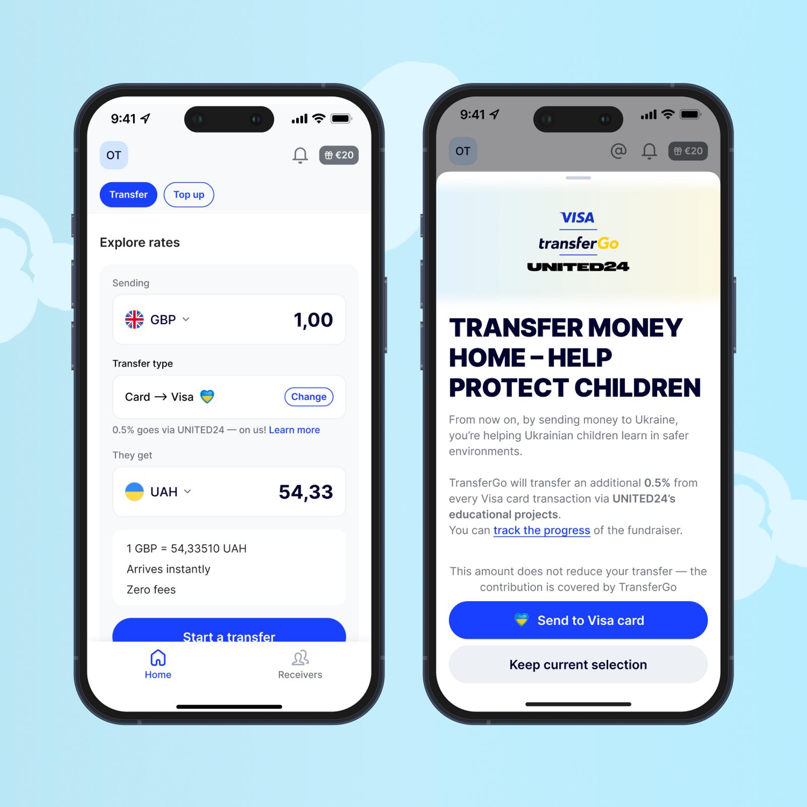 And this won’t require extra money from customers — TransferGo will transfer an additional 0.5% from every transaction to Visa cards in Ukraine, supporting UNITED24’s educational projects.