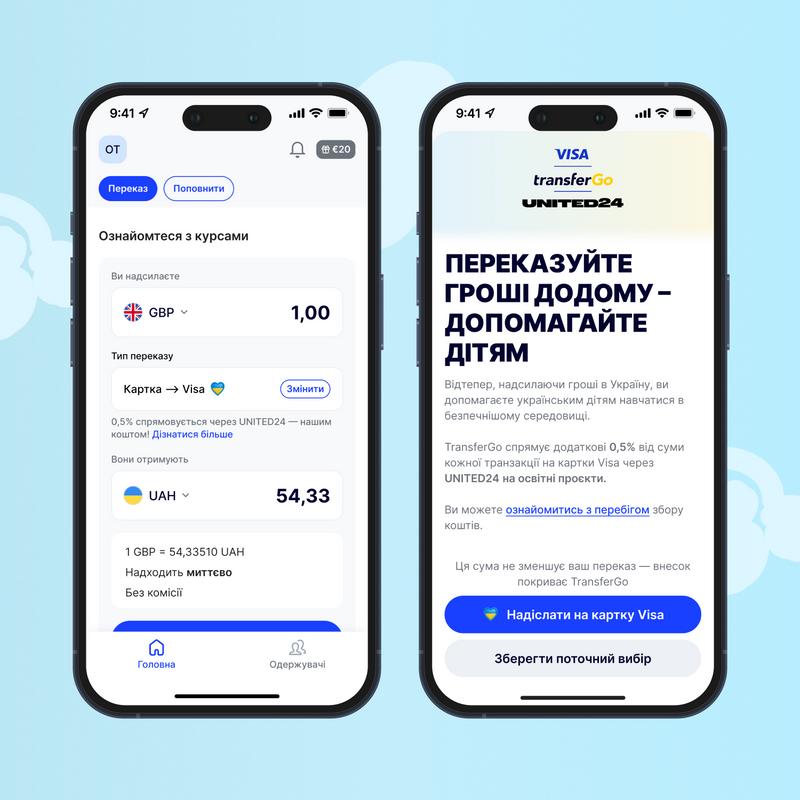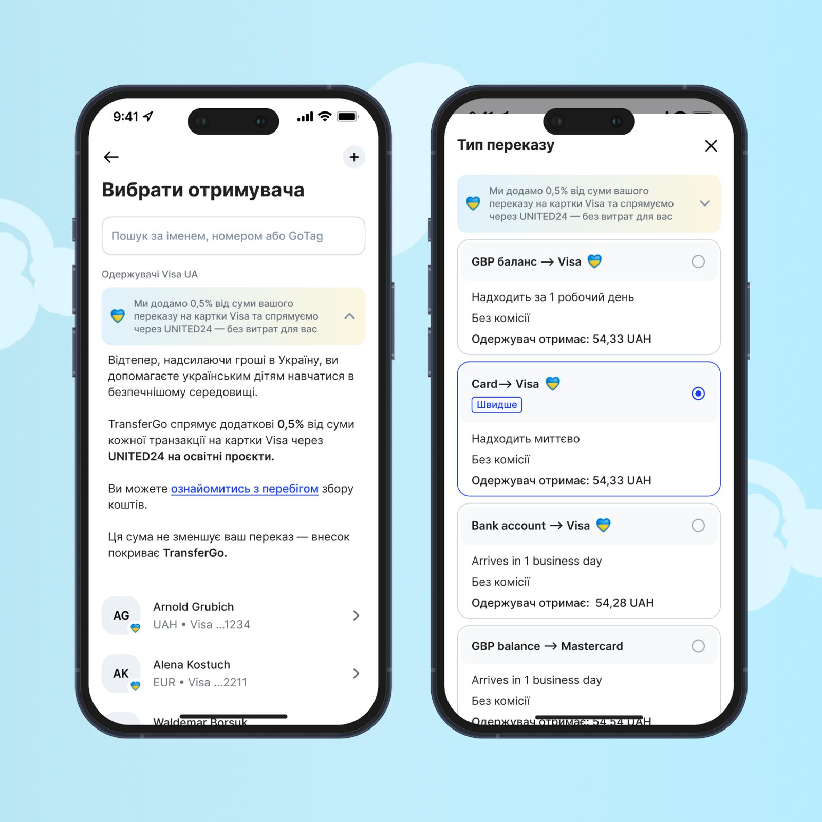 І це без внесків від клієнтів сервісу — TransferGo перераховуватиме додаткові 0,5% з кожної транзакції на картки Visa в Україні на підтримку освітніх проєктів UNITED24.